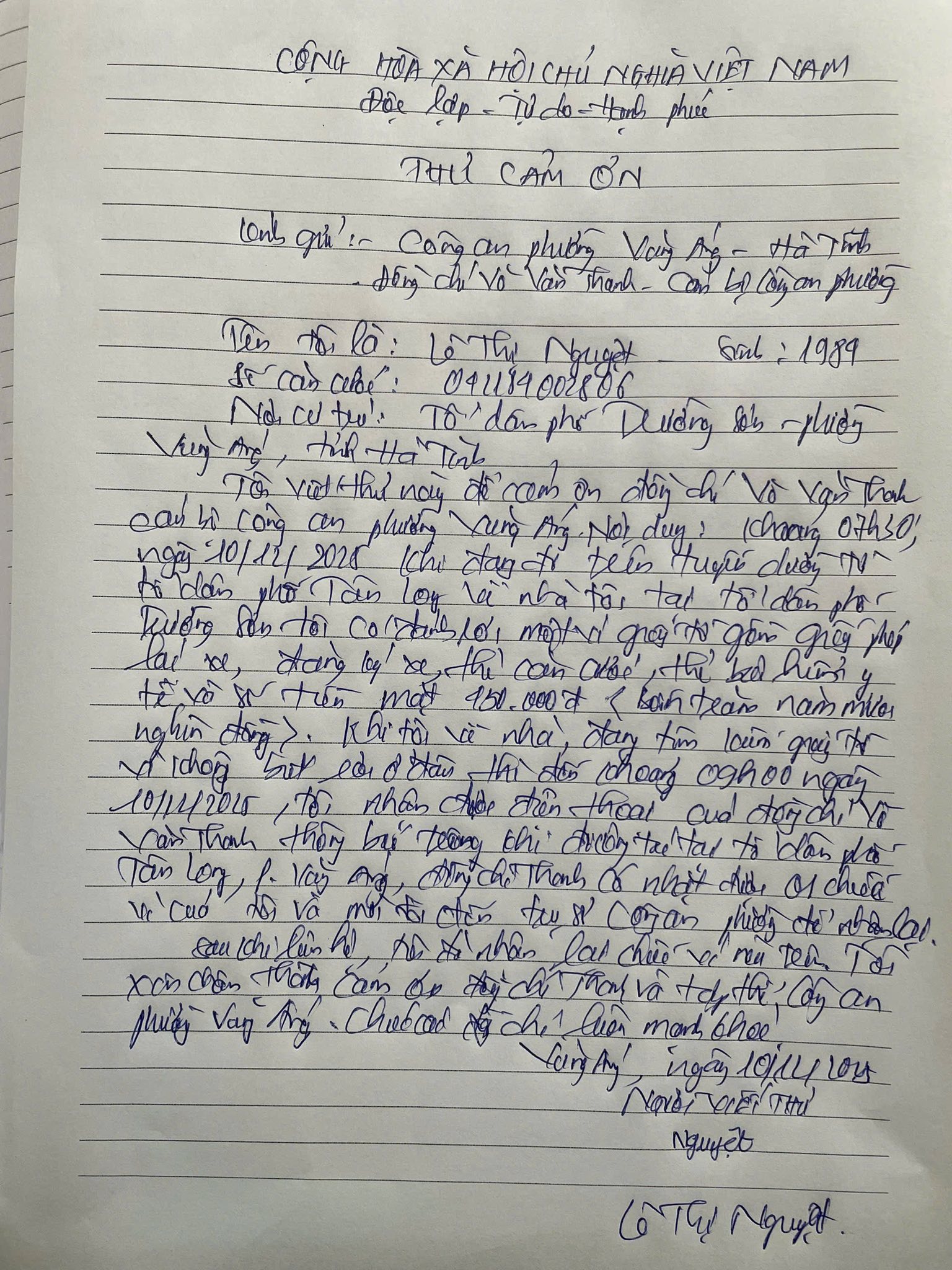 Nhận lại tài sản, chị Lê Thị Nguyệt đã xúc động và bài tỏ lời cảm ơn sâu sắc đến Công an phường Vũng Áng nói chung và đồng chí Võ Văn Thanh nói riêng. Hành động này thể hiện rõ tinh thân “Vì nhân dân phục vụ”, trách nhiệm và phẩm chất đạo đức của cán bộ, chiến sĩ Công an nhân dân.