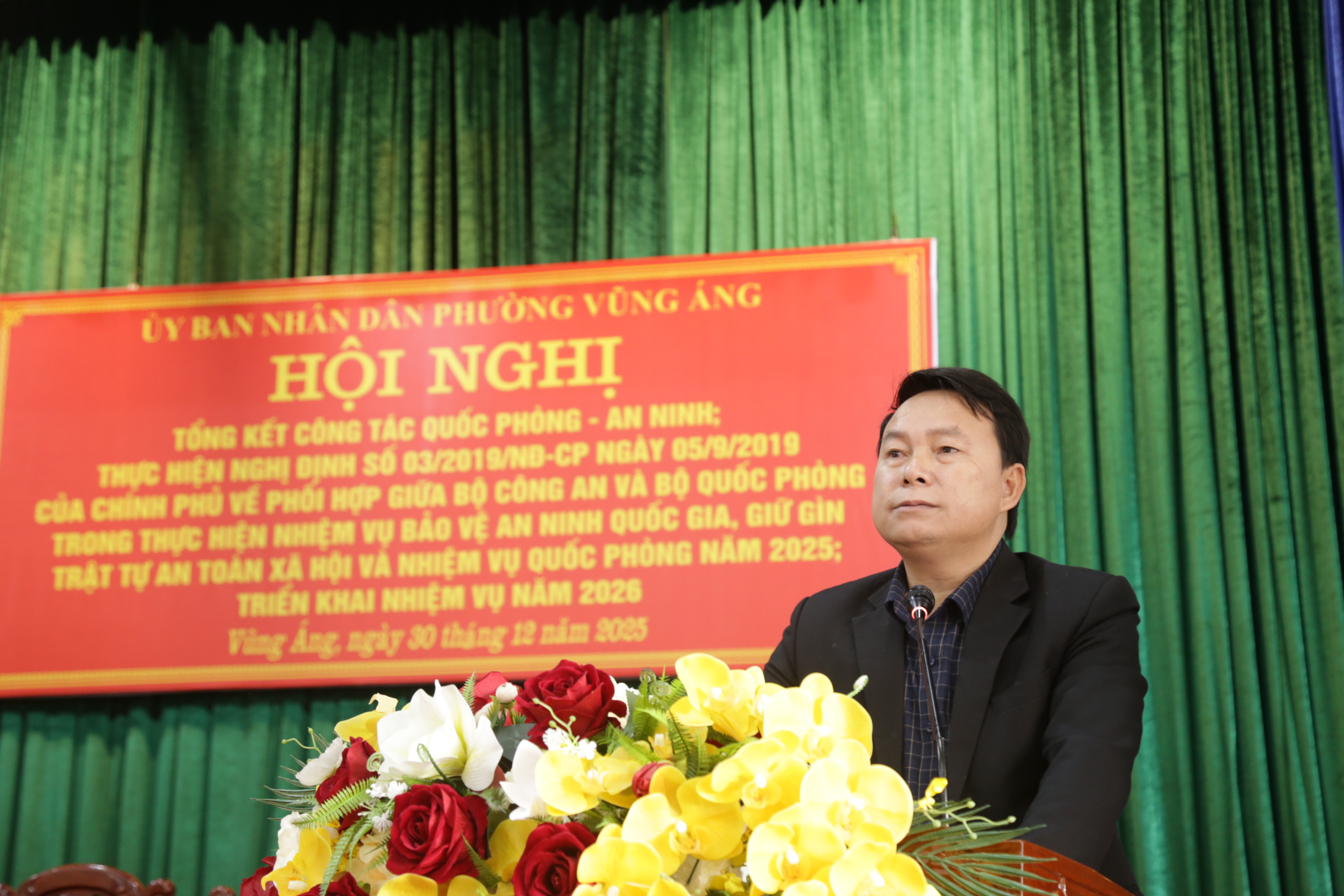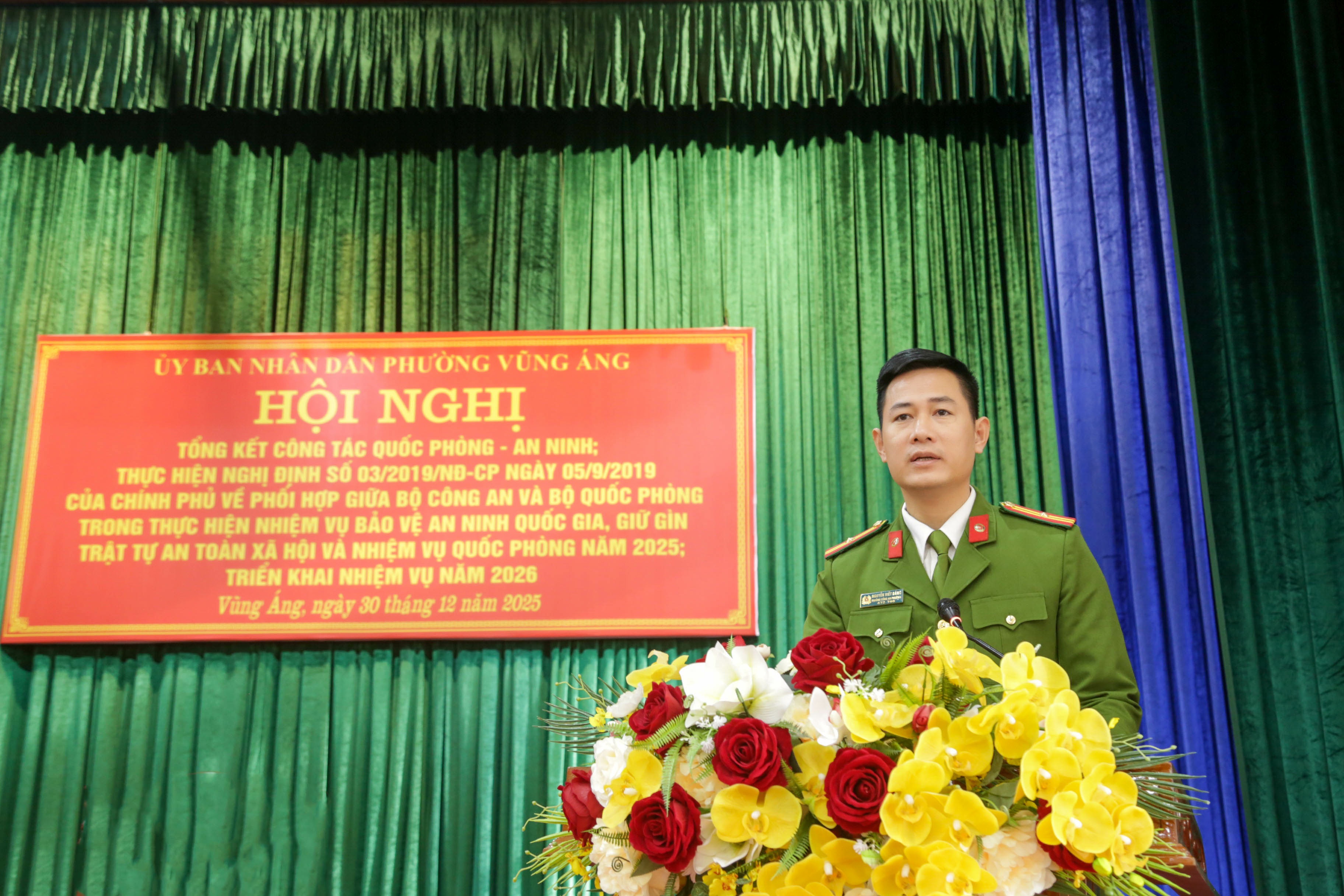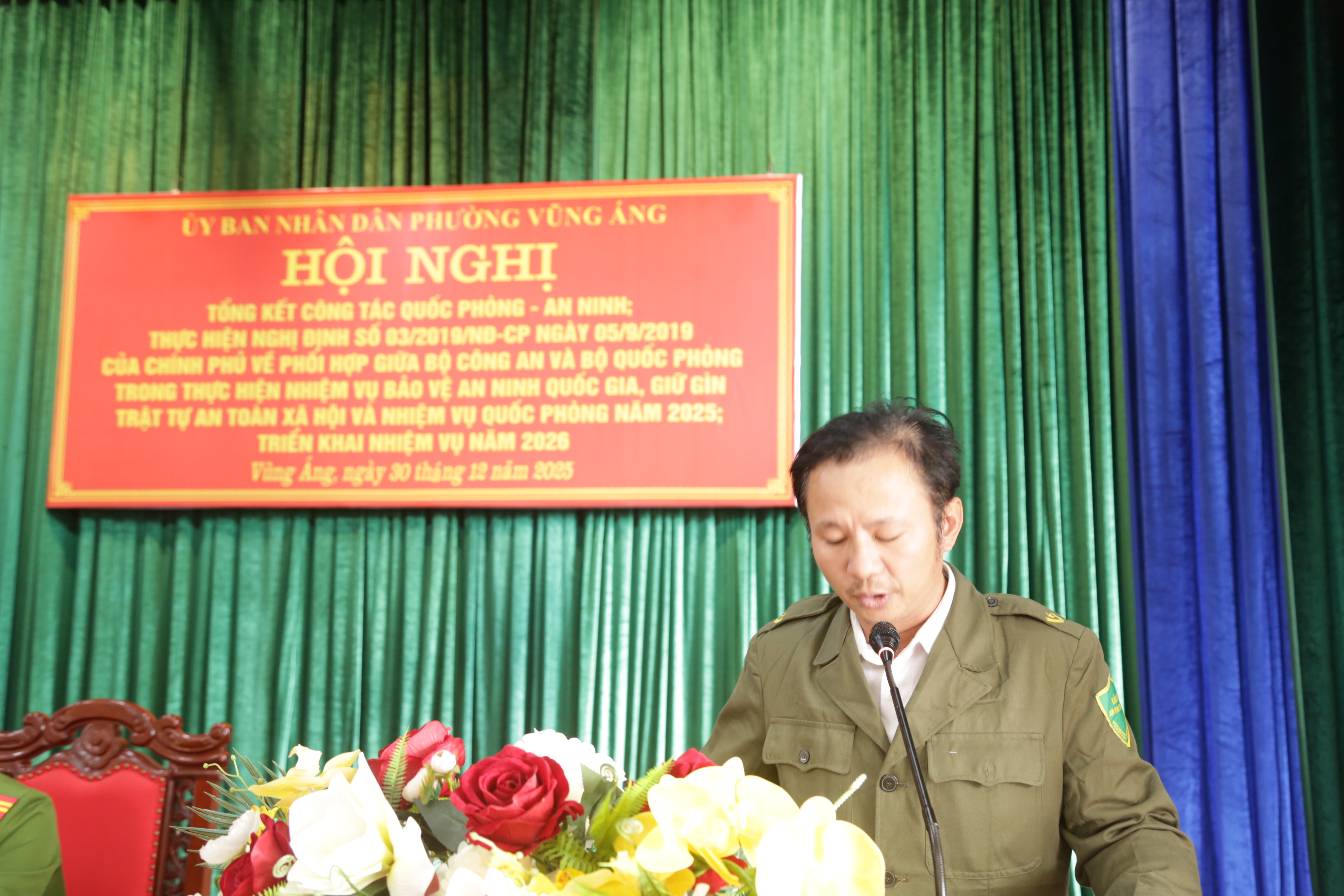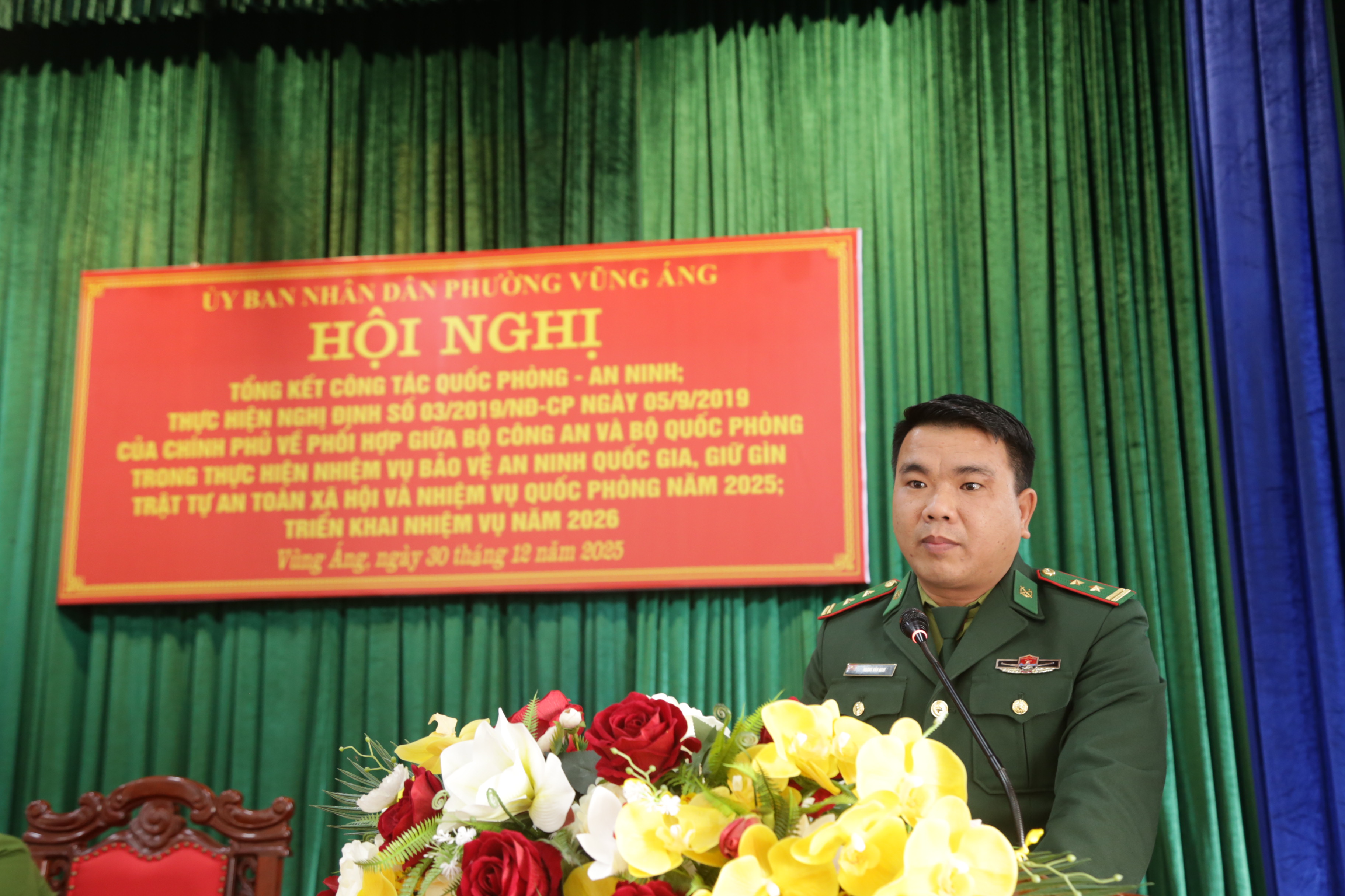 Phát biểu chỉ đạo tại hội nghị, đồng chí Trung tá Nguyễn Thái Sơn, Phó Chỉ huy trưởng BCH Phòng thủ KV3 Kỳ Anh, ghi nhận và đánh giá cao kết quả QP-AN của phường Vũng Áng năm 2025, đồng thời thông tin nhanh tình hình an ninh thế giới, khu vực và trong nước, nhấn mạnh những diễn biến phức tạp, khó lường, tiềm ẩn nguy cơ đối với an ninh quốc gia. Đ/c đề nghị lực lượng vũ trang, Công an, Quân sự, dân quân tự vệ và các đơn vị phối hợp tại phường chủ động nắm chắc tình hình, duy trì chế độ trực sẵn sàng chiến đấu, thực hiện tuần tra, kiểm soát, phòng ngừa tình huống và chuẩn bị chu đáo, đồng bộ cho công tác giao – nhận quân 2026. Đ/c cũng đề nghị cấp ủy, chính quyền phường quan tâm chỉ đạo, phối hợp, tạo điều kiện thuận lợi để lực lượng hoàn thành nhiệm vụ, chăm lo hậu phương quân đội, thăm hỏi, động viên thanh niên nhập ngũ và gia đình, góp phần củng cố thế trận quốc phòng toàn dân, bảo đảm ANTT và phát triển kinh tế – xã hội.