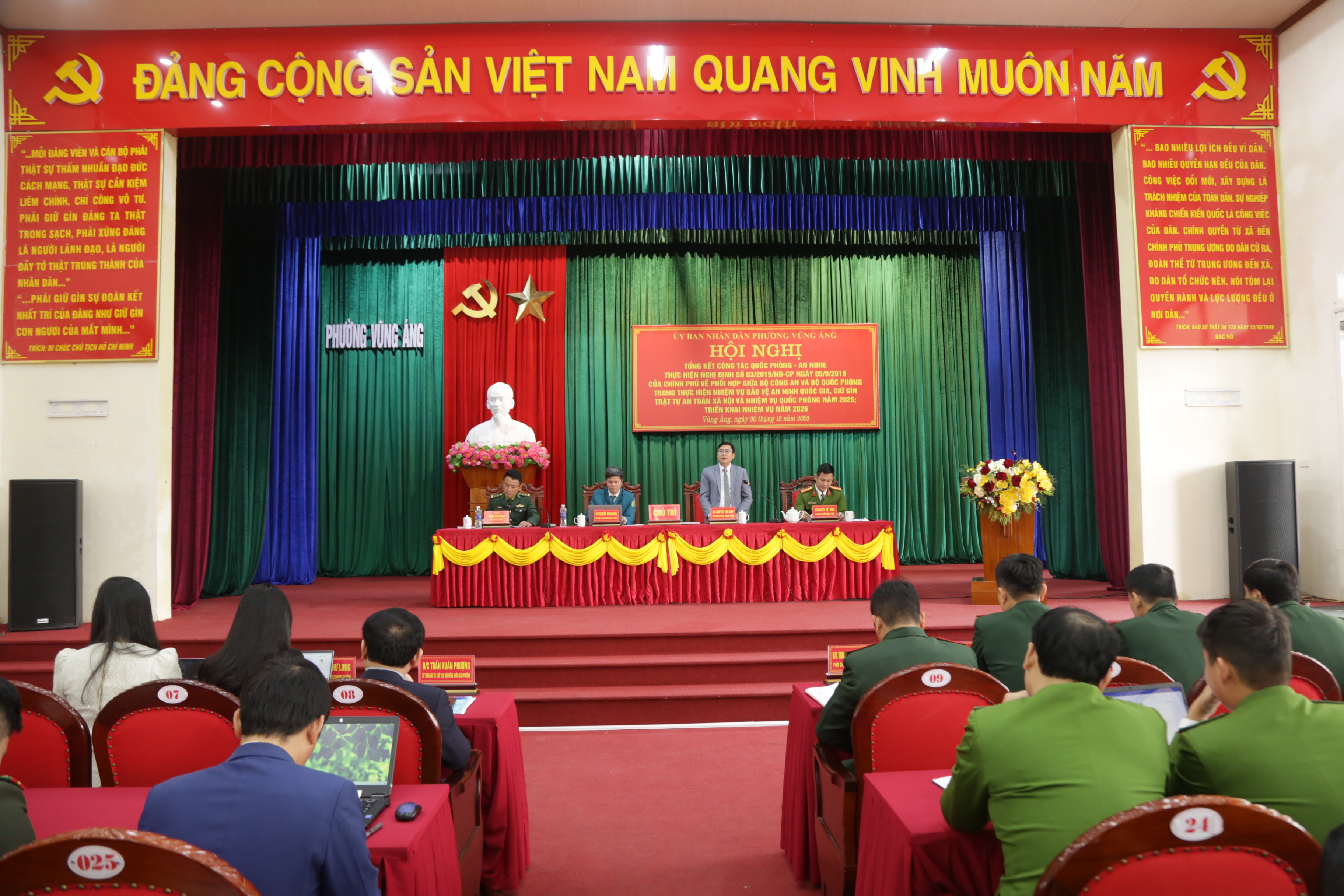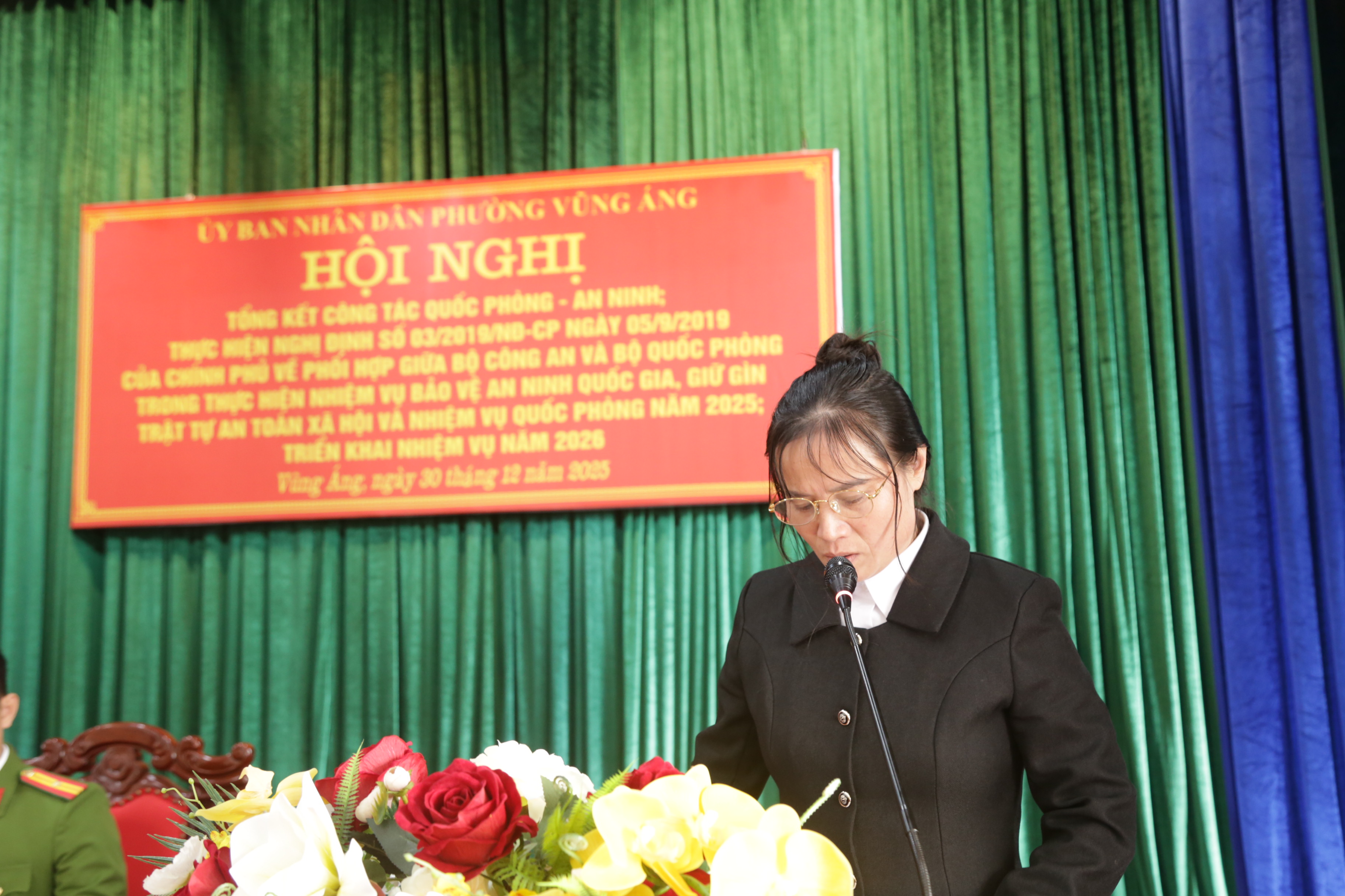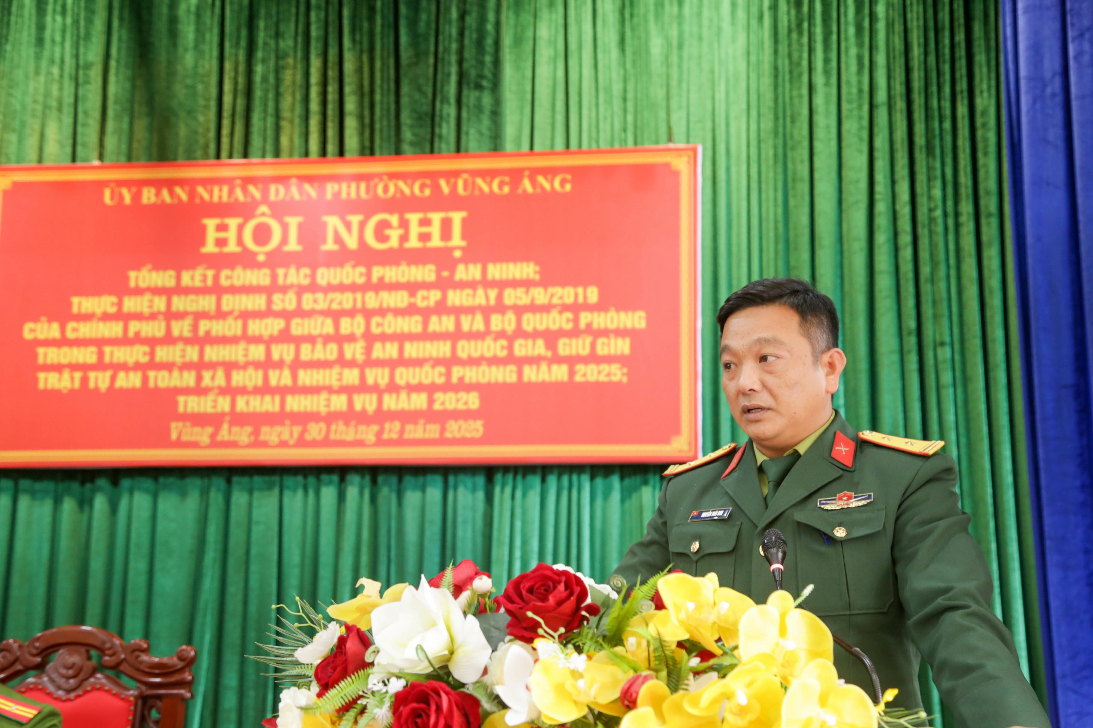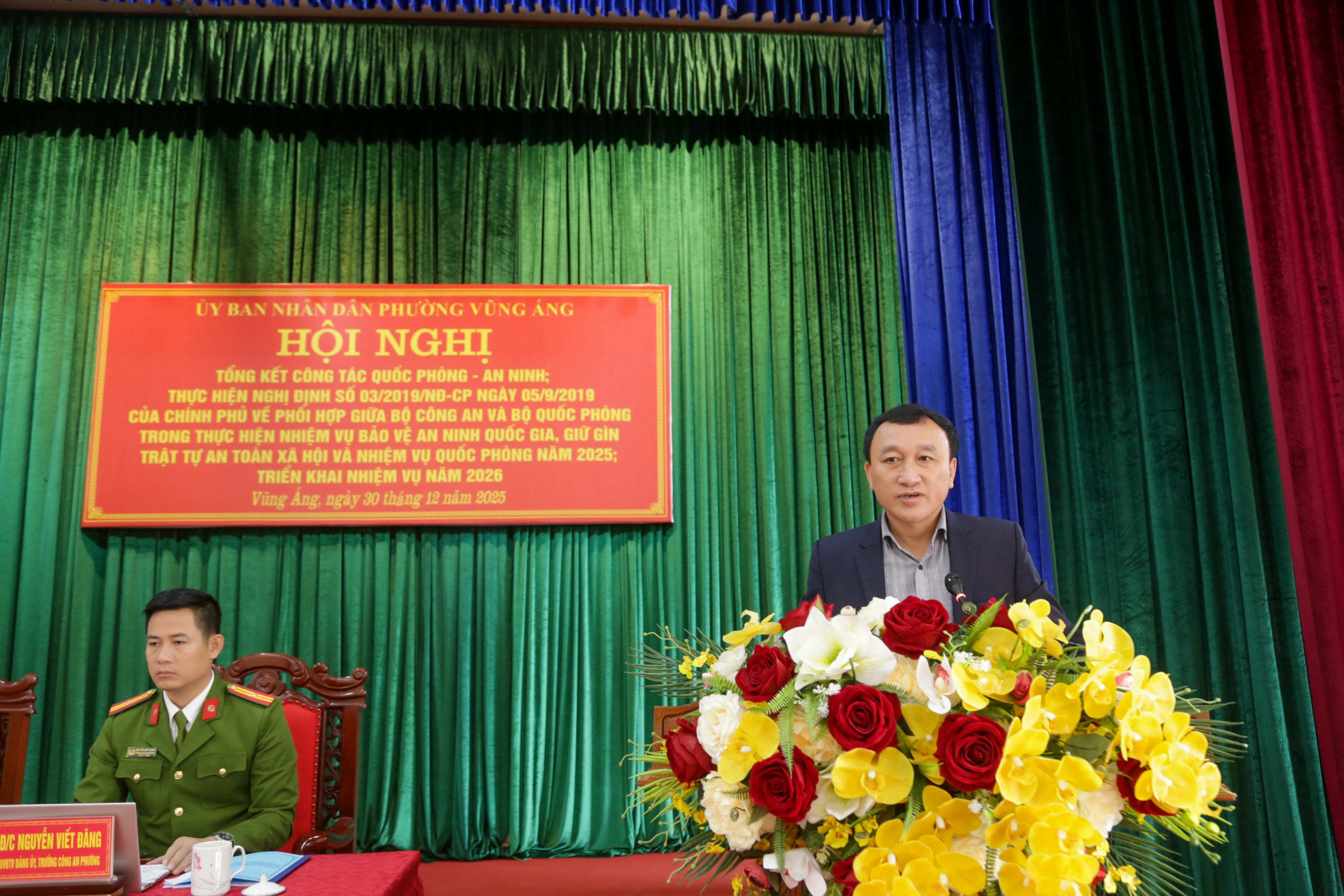 Phát biểu chỉ đạo tại hội nghị, đồng chí Trung tá Nguyễn Thái Sơn, Phó Chỉ huy trưởng BCH Phòng thủ KV3 Kỳ Anh, ghi nhận và đánh giá cao kết quả QP-AN của phường Vũng Áng năm 2025, đồng thời thông tin nhanh tình hình an ninh thế giới, khu vực và trong nước, nhấn mạnh những diễn biến phức tạp, khó lường, tiềm ẩn nguy cơ đối với an ninh quốc gia. Đ/c đề nghị lực lượng vũ trang, Công an, Quân sự, dân quân tự vệ và các đơn vị phối hợp tại phường chủ động nắm chắc tình hình, duy trì chế độ trực sẵn sàng chiến đấu, thực hiện tuần tra, kiểm soát, phòng ngừa tình huống và chuẩn bị chu đáo, đồng bộ cho công tác giao – nhận quân 2026. Đ/c cũng đề nghị cấp ủy, chính quyền phường quan tâm chỉ đạo, phối hợp, tạo điều kiện thuận lợi để lực lượng hoàn thành nhiệm vụ, chăm lo hậu phương quân đội, thăm hỏi, động viên thanh niên nhập ngũ và gia đình, góp phần củng cố thế trận quốc phòng toàn dân, bảo đảm ANTT và phát triển kinh tế – xã hội.