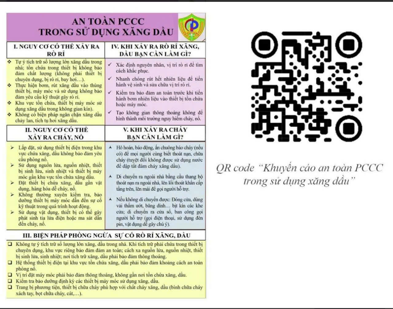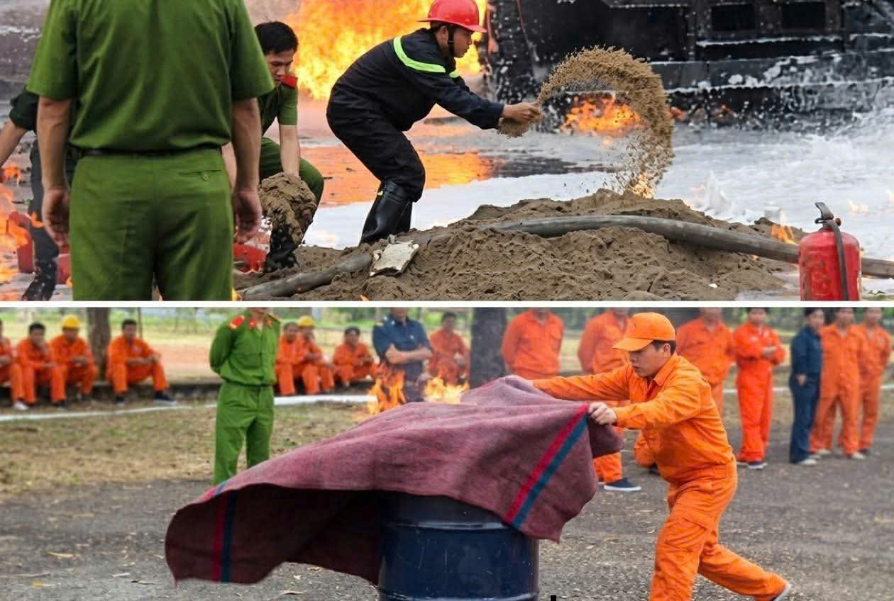 sơ tán tài sản, phuy xăng, dầu lân cận (nếu có) ra vị trí an toàn; không chữa cháy xăng, dầu bằng nước; dùng bình chữa cháy xách tay để dập tắt đám cháy; dùng cát để ngăn không cho cháy lan; dùng chăn chiên thấm nước phủ bề mặt của đám cháy./.