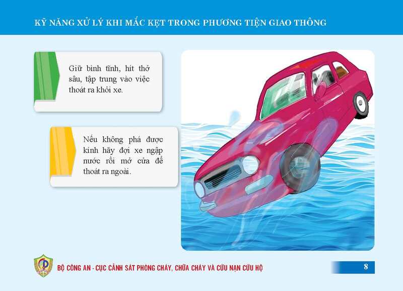 7, Tìm cách thoát khỏi xe càng sớm càng tốt bằng cách thoát qua cửa sổ trờ (nếu có); Sử dụng búa thoát hiểm hoặc bất kỳ vật sắc nhọn (khóa dây an toàn, cờ lê, giày gót nhọn, búa, điện thoại,…) để phá kính thoát ra bên ngoài.