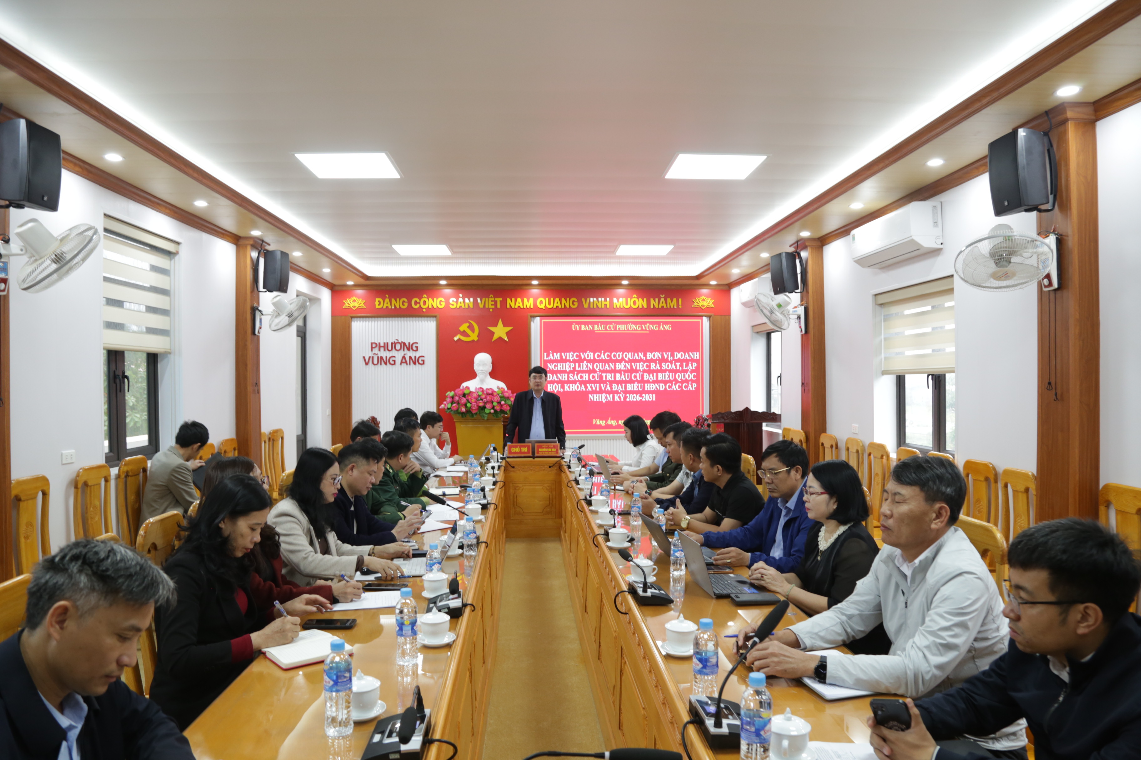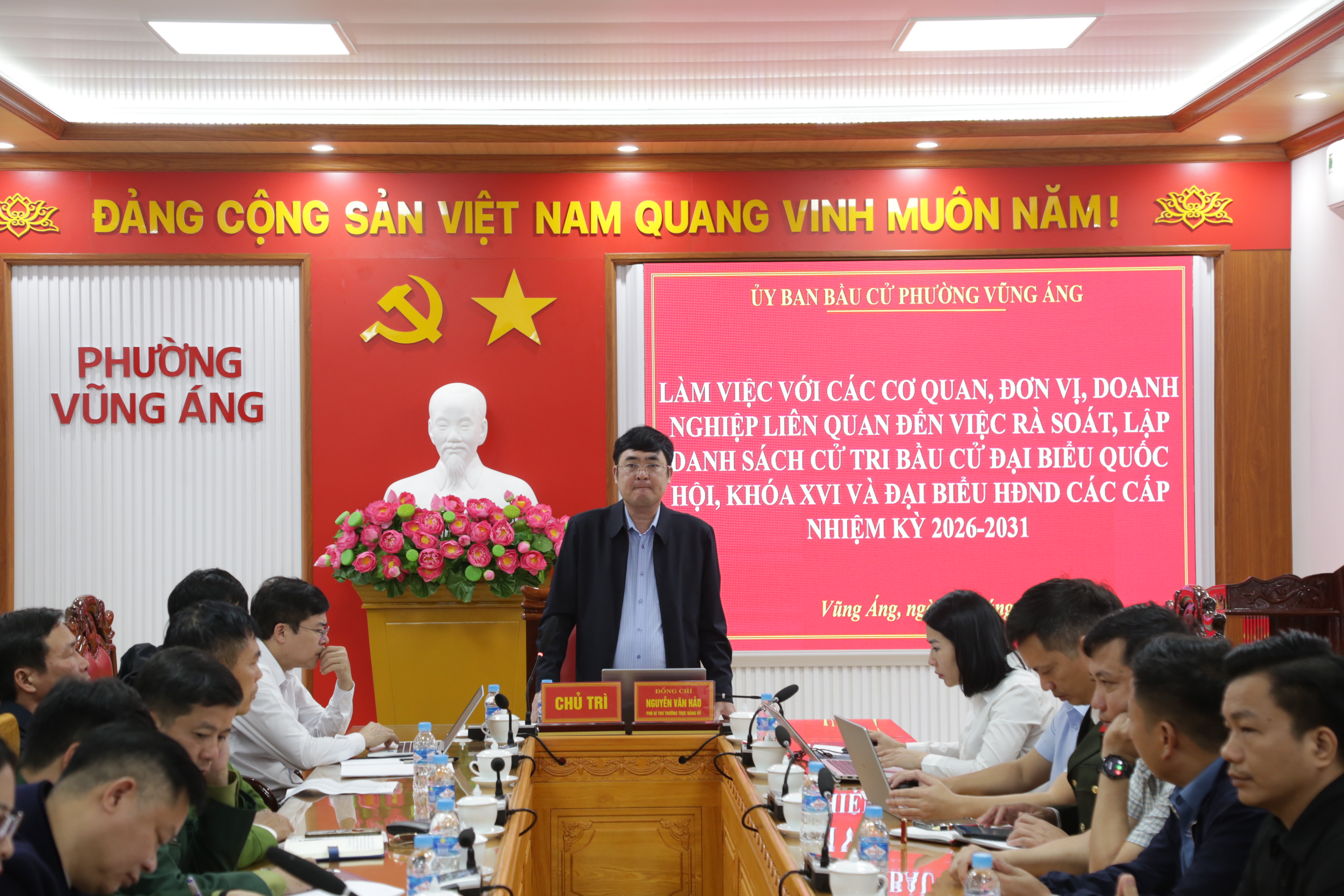 Đ/c: Nguyễn Văn Hảo – Phó Bí thư Thường trực Đảng ủy, Phó Chủ tịch Ủy ban bầu cử phường chủ trì cuộc làm việc. Tham dự có các đồng chí trong Ủy ban bầu cử phường; lãnh đạo các cơ quan, đơn vị, doanh nghiệp đang hoạt động trên địa bàn.