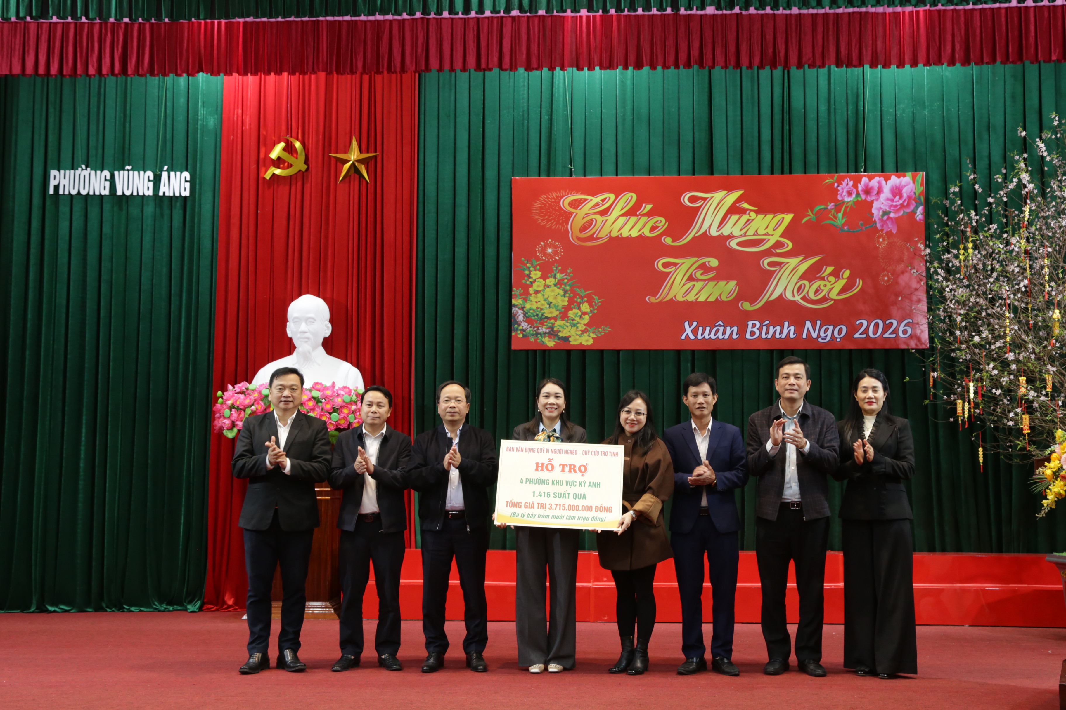 Thông qua công tác vận động xã hội hóa, hàng nghìn suất quà Tết đã được trao tận tay cho bà con nhân dân trên địa bàn, kịp thời động viên, chia sẻ khó khăn với người dân trong dịp Tết đến, xuân về. Kết quả, phường Vũng Áng đã tổ chức trao 1.138 suất quà với tổng kinh phí 788.400.000 đồng, trong đó, hộ nghèo: 183 suất, mức hỗ trợ 1.100.000 đồng/suất, tổng 201.300.000 đồng. Hộ cận nghèo: 261 suất, mức hỗ trợ 600.000 đồng/suất, tổng 156.600.000 đồng. Hộ chính sách: 22 suất, tổng 12.000.000 đồng. Các lượt hộ có hoàn cảnh khó khăn: 672 suất, mức hỗ trợ từ 500.000 đồng đến 1.250.000 đồng, tổng 418.500.000 đồng.