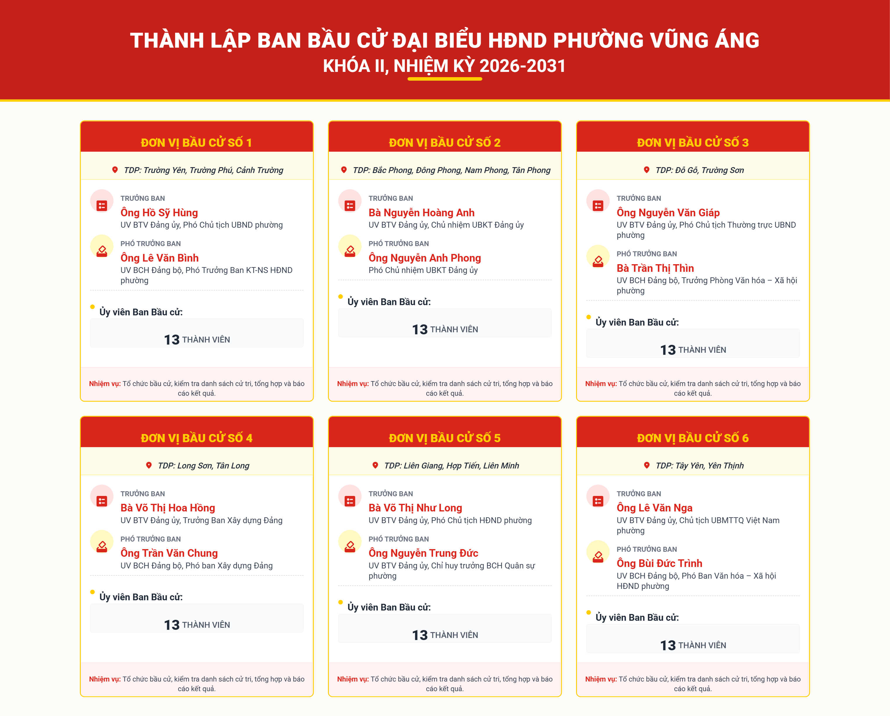 Mỗi Ban Bầu cử: 15 thành viên (Trưởng Ban, Phó Trưởng Ban và 13 Ủy viên)